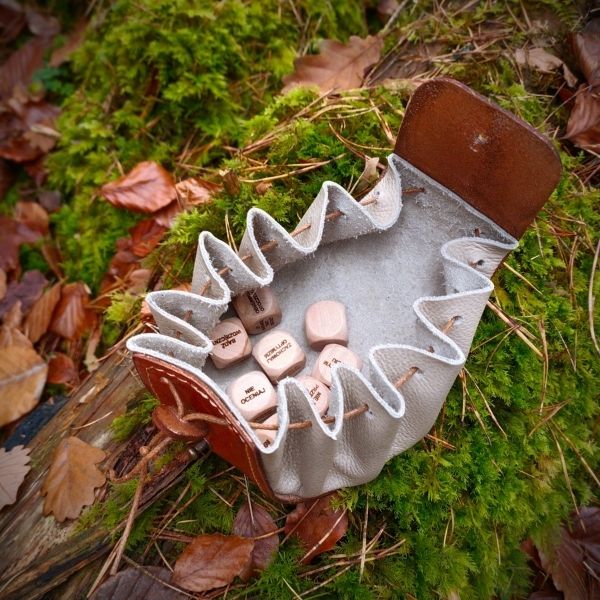 Komplet jaki zawarty jest w skórzanej sakwie składa się z 11 drewnianych kości.